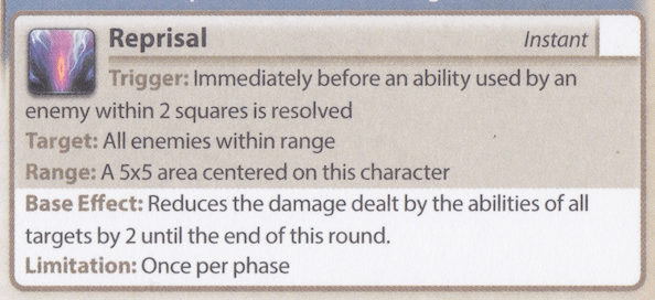 Reprisal does not stipulate a specific phase, so an alert player could use Reprisal during another player’s turn in the Adventurer phase in reaction to an enemy’s Instant ability. Further, if you are especially alert, you will note that you can use this Instant ability up to two times per round, as it’s limitation is “once per phase”, and there are two phases in every round.