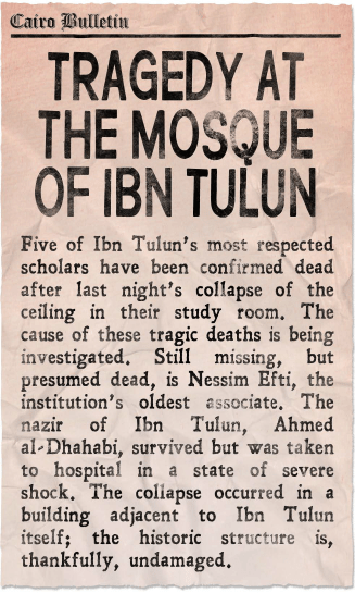 Deciding that returning to Mycerinus’ pyramid would be suicide, the party breaks up tries to discern the Brotherhood‘s next move. Taylor spies the day’s edition of the Cairo Bulletin and sees a headline about the Ibn Tulun mosque.