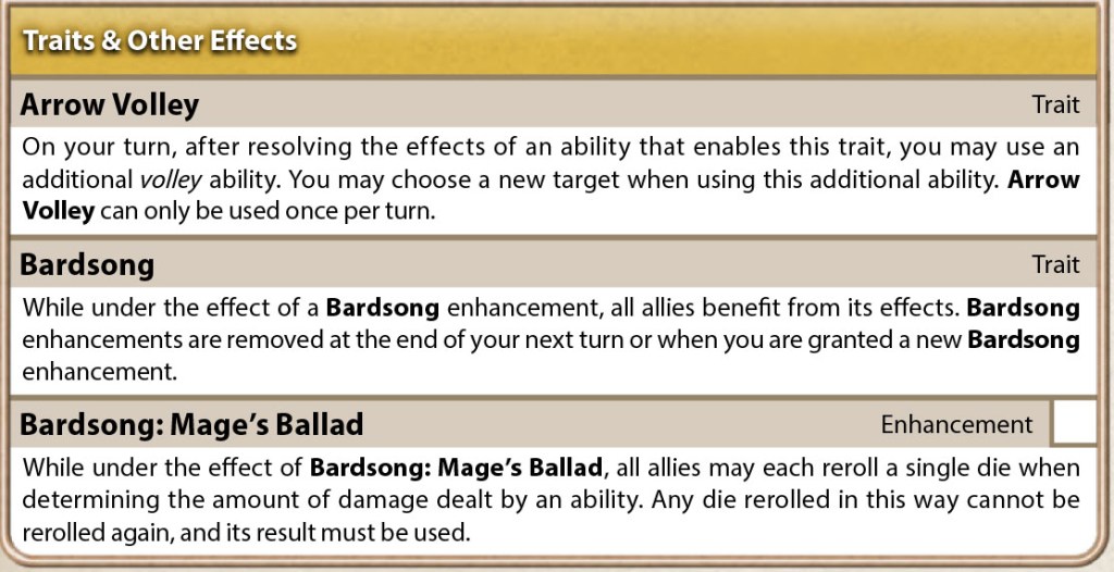 So … is the bard overpowered? Are we seeing power creep at play here? With a range that exceeds all of the battle map sizes in the starter set, a limit break with an infinite length, an Enhancement that confers either a free damage re roll, and an Enfeeblement that gives everyone an Advantage die, with the only cost being that some of the abilities are limited to once per phase – – the GM will be hard-pressed to keep enemies standing if the bard is on the field.
