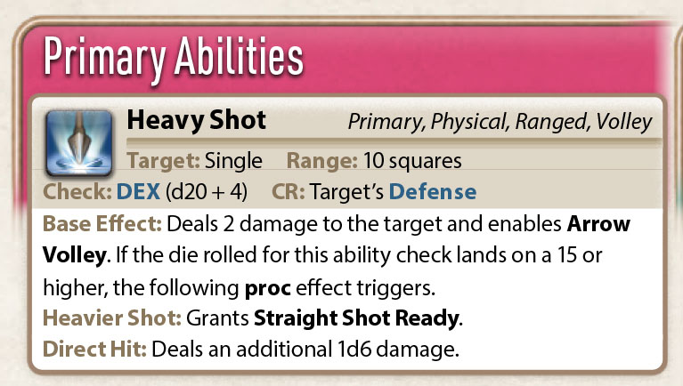 The main primary ability of the bard is Heavy Shot. It has a Proc of 15 and enables Arrow Volley. On a 15+, Heavy Shot grants the effect of Straight Shot Ready.