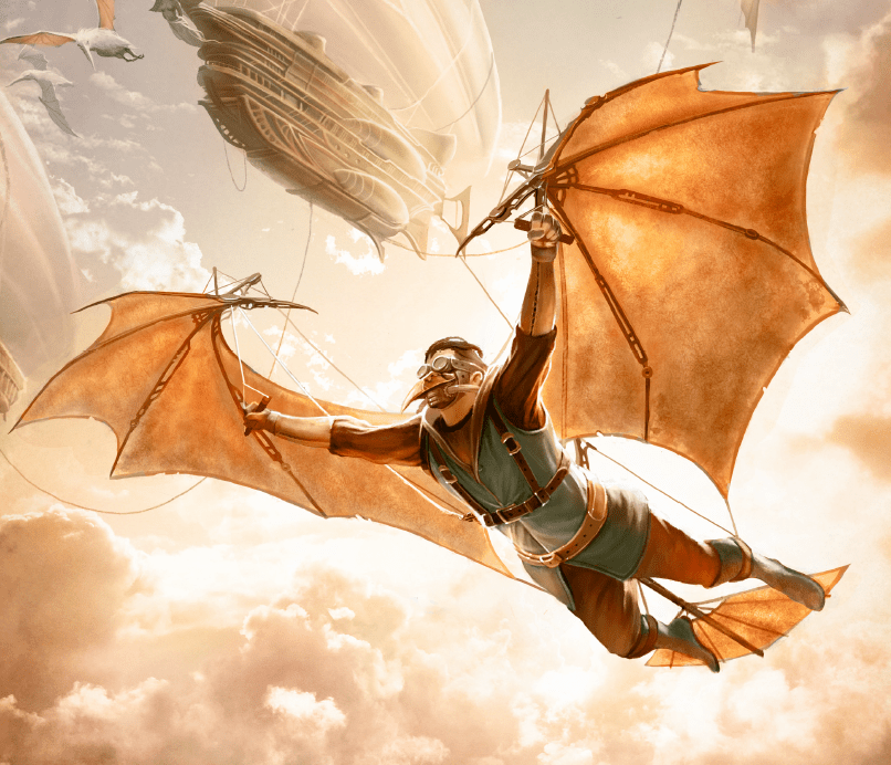 The theory of flight, a phonographic article by airship captain Charlotte Aurige, available at the library of Aeolus. This section introduces us to another specialist: the icarian; glider-wing equipped people that fly between airships and maintain them during flight. The similarity to the name Icarus is not lost on me. 🙂 An icarian graces the cover of the Players Guide.