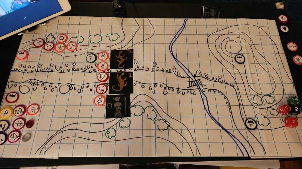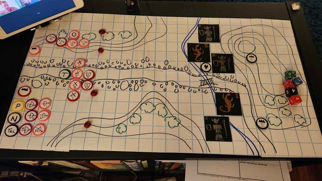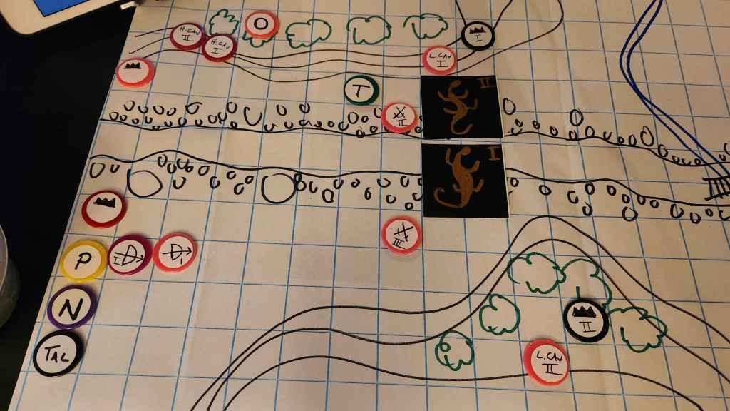 The Ymari host moves forward with their shield wall and infantry to block passage through the vale at the edge of remaining archery unit’s inside range. Units of giant lizards and hill giants move up to meet the shield wall and there is a deadly exchange. Trake, who is commanding the infantry, sees his unit utterly destroyed and is buried under a stampeding giant lizard as it tramples his unit to pulp. Using his token of Katopodis, Trake survives the attack.