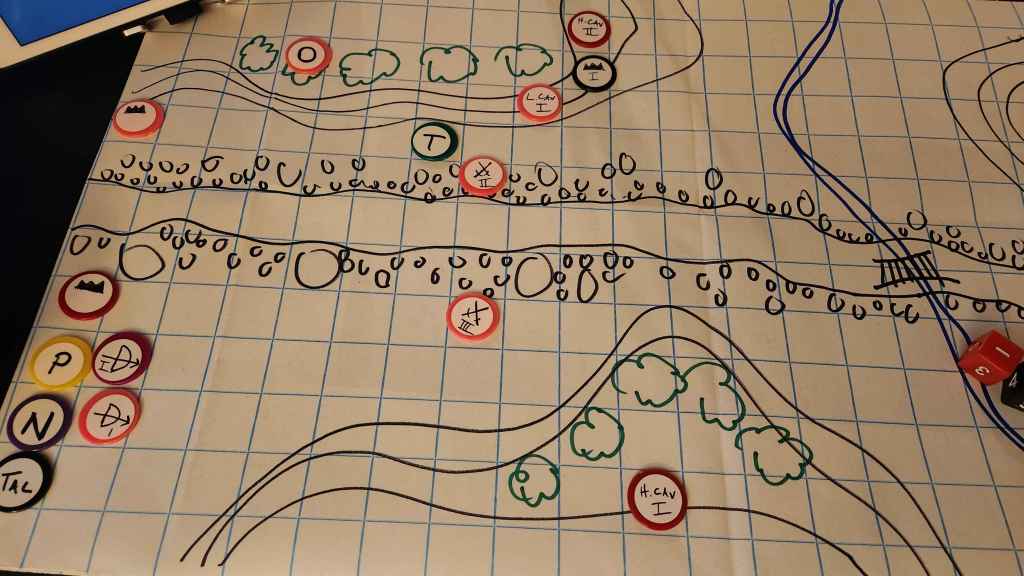 SCENE 03 – The host advances upon the hill giant’s line, staying back. They send their cavalry to the ridgeline to the north and quickly ready their archers just south of the Dwarf-road. The hill giant force now sees the host in the distance but does not advance. The opening volley from the host informs the hill giants of their intent, a devastating attack that tears through a unit of dire wolves.
