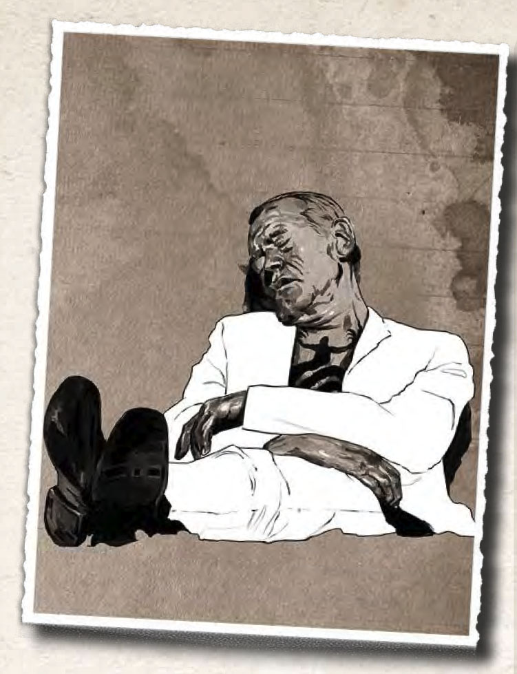 Slumped against a wall not far from the dead policemen is Larkin, seemingly asleep, but the smell and nearby paraphernalia confirming that he is high on heroin, slumped against the wall, candles guttering around him.
