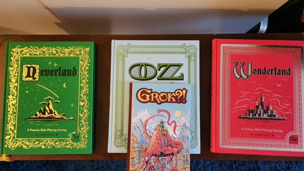 As is tradition, I will be running an off-site game each night (Thursday – Saturday). The plan for this year’s game is to run three one shots based on Andrew Kolb’s fantastic fantasy settings (Neverland, Oz, and Wonderland), but powered by Grok?! instead of 5e Dungeons & Dragons.